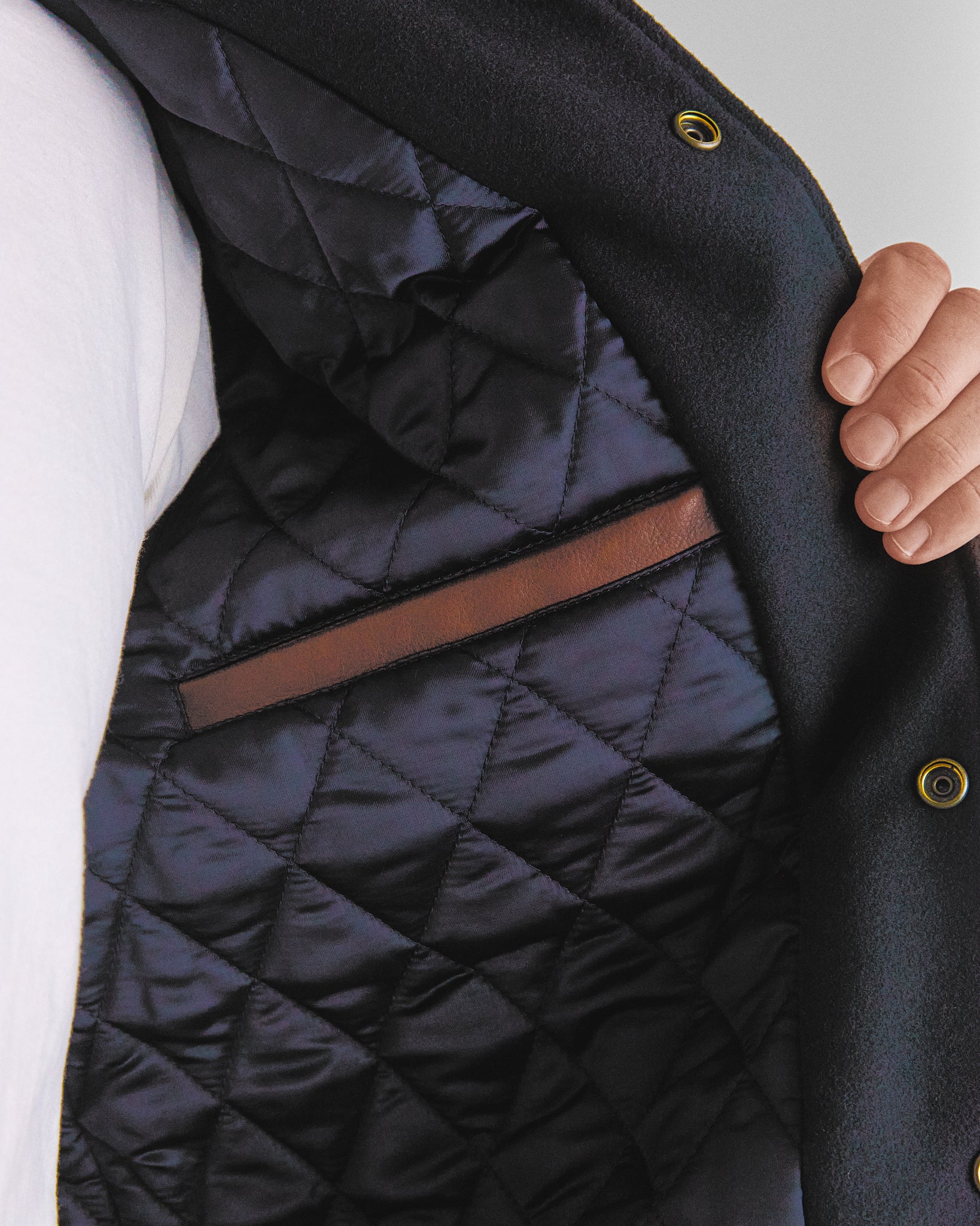 Contemporary Western Varsity Jacket in Melton Wool and Leather Trim, wool-blend knit ribbing with cuff protector, and satin acetate lining.